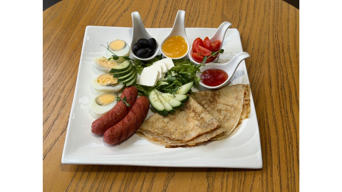 Sausages, olives, bryndza cheese, toast, mixed salad, cherry tomatoes, cucumbers, boiled egg, pancakes, honey, jam