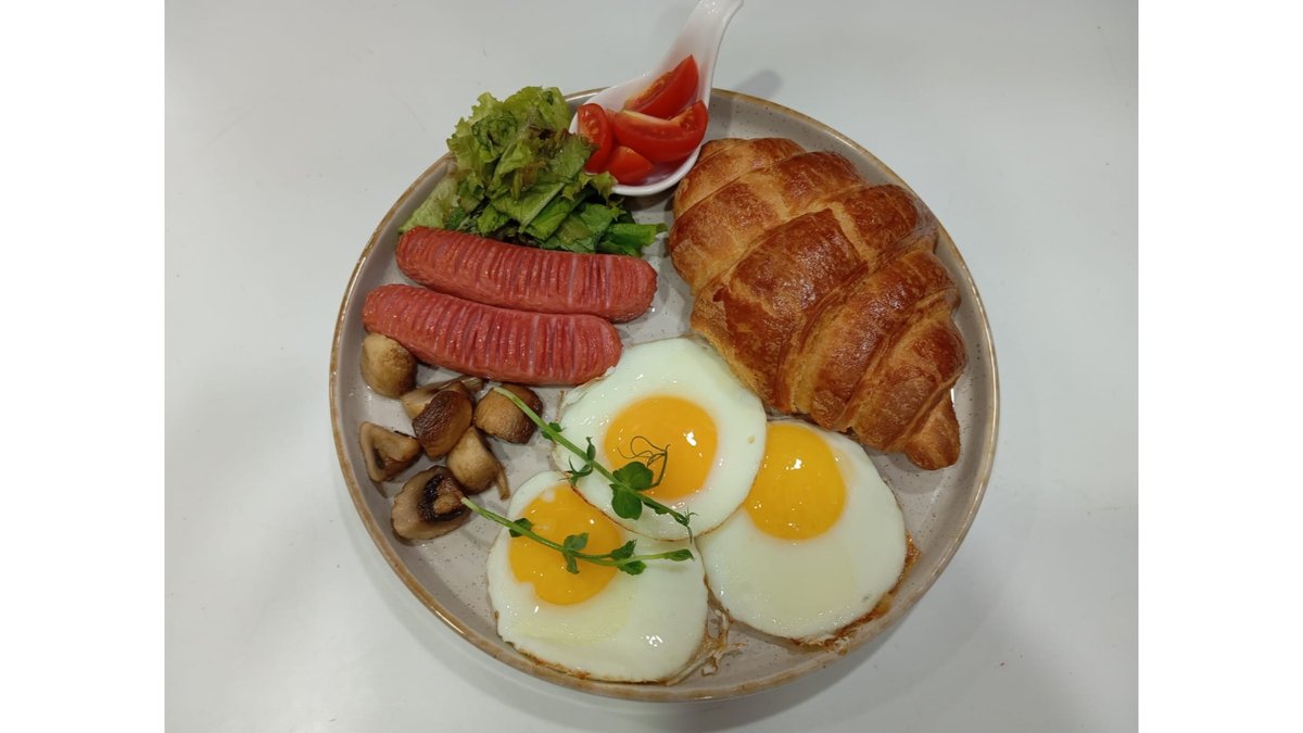 Fried eggs, cherry tomatoes, mushrooms, mixed salad, spicy sauce, beef sausages, croissant