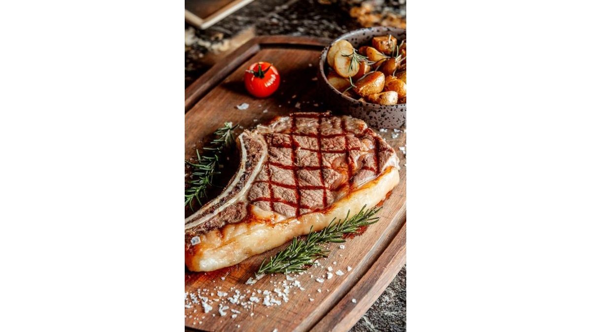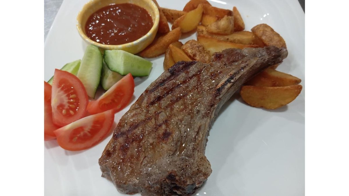 Horse meat steak with wedges, vegetables, and chimichurri sauce