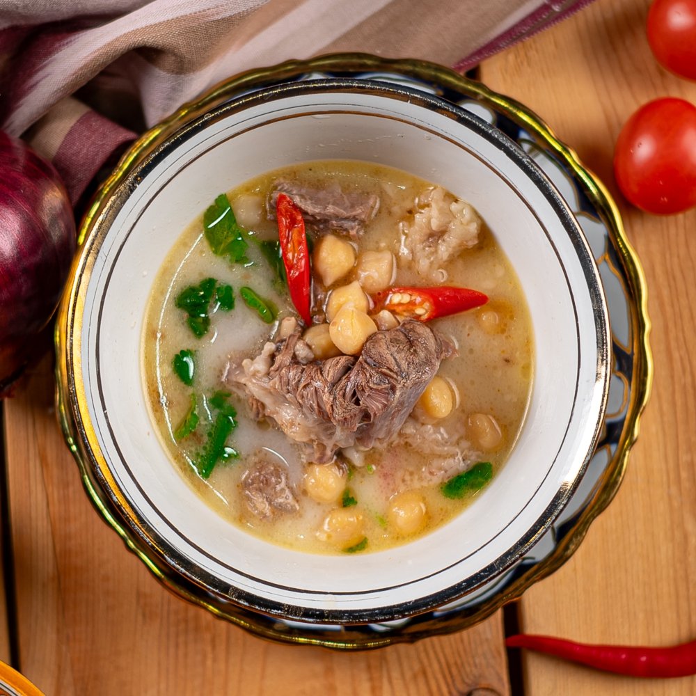 Наваристая говяжья шурпа с мясом ,отварным нутом и йогуртом. Украшаем острым стручковым перцем и кинзой 450гр