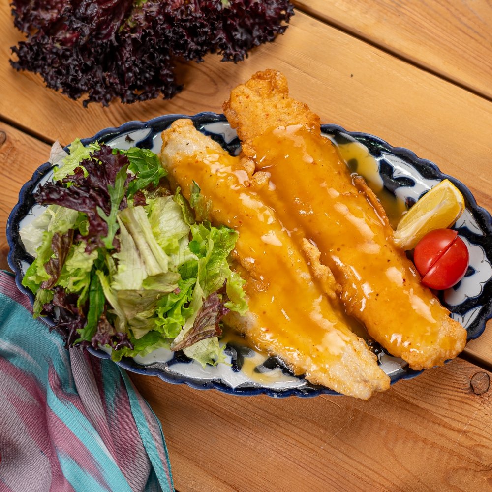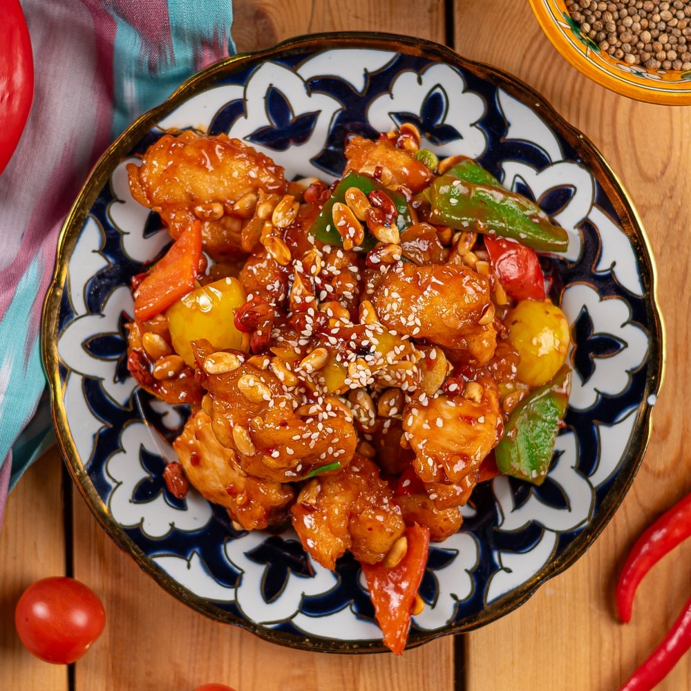 Микс листьев салата, помидор, огурец, перец, вырезка телятины, обжаренная в кунжуте. Остро-сладкий соус с ароматом чеснока, чили и кунжута. Порция: 250 гр.