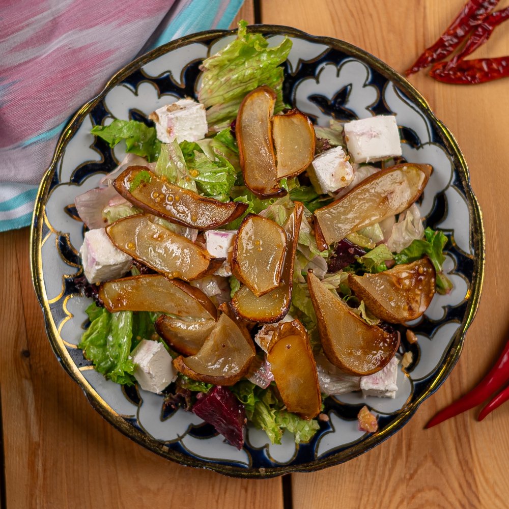 Обжаренная на гриле груша с миксом листьев салата и отварной свеклой. Подаем с сыром Фетакса 380гр