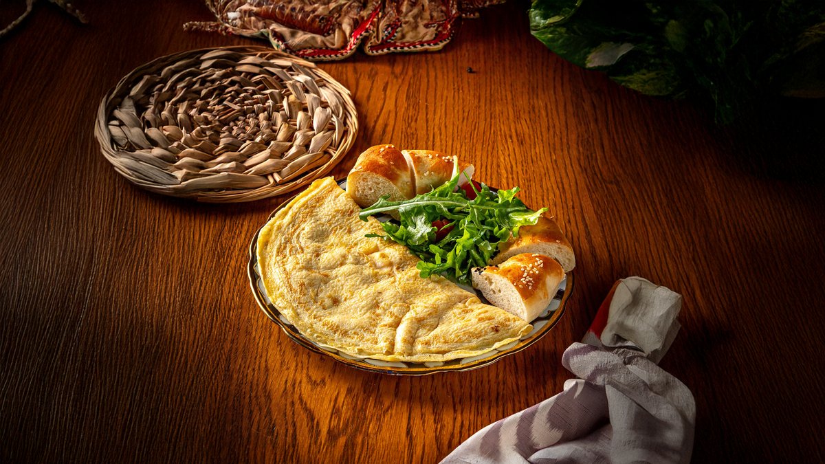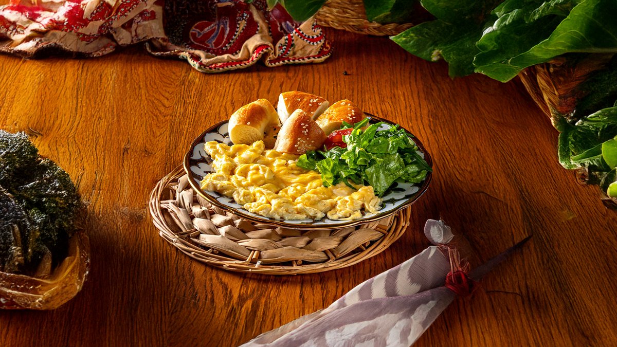 взбитые яйца подаются с салатом микс и лепешкой 200гр