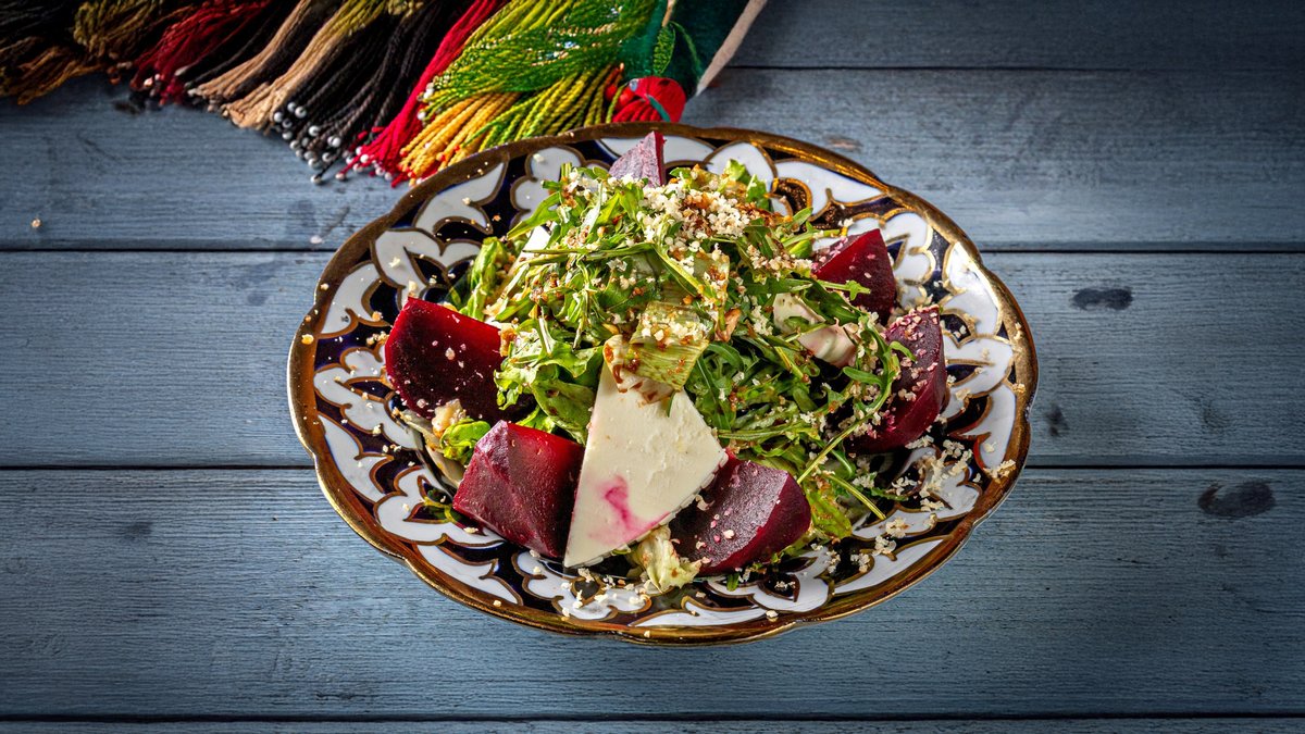 запеченная свекла ,домашний сыр,руккола,айсберг,сулугуни,грецкий орех 280гр