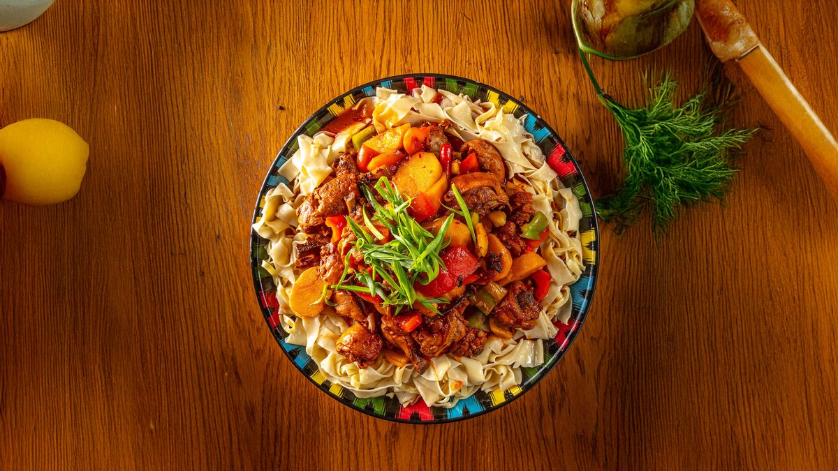 Традиционное уйгурское блюдо из говядины с овощами такими как фасоль и дайкон тушеными в казане и ароматными специями (бадьян, имбирь, кориандр), домашняя тянутая (длинная) лапша. и острота на выбор 400 гр.