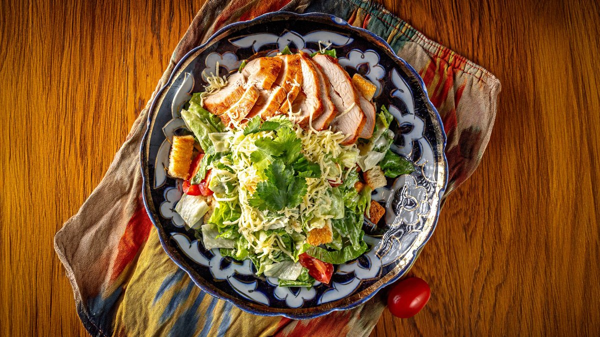 Ломтики копченой курицы, помидоры черри, отварные шиитаке, пикантные сухарики и хрустящие листья салата Айсберг. Соус на основе йогурта, брынзы, мяты и чеснока. 250 гр.