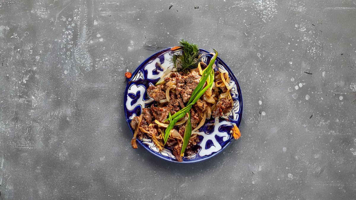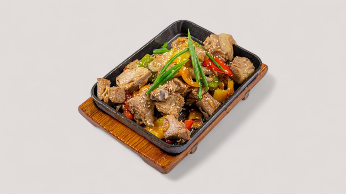 Знаменитый куырдак из ливера, лука и картофеля. В нашем рецепте еще добавляются ломтики говяжьего антрекота и бараньи ребрышки (семечки). Подается на горячей тыквенной либо томатной лепешке. 570 гр.