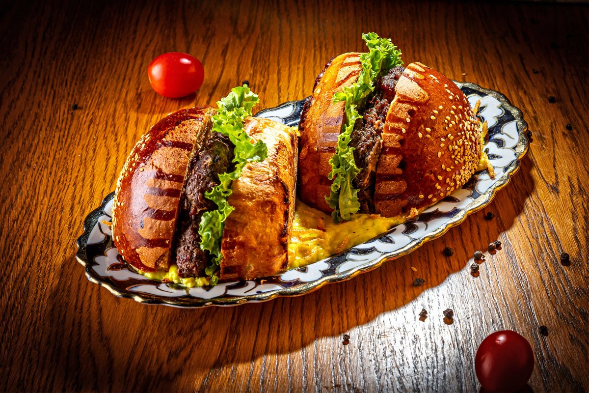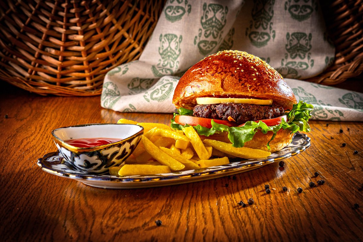 говяжья сочная котлета ,айсберг,соленые огурцы,помидор ,айсберг.фри,лук,сырный соус