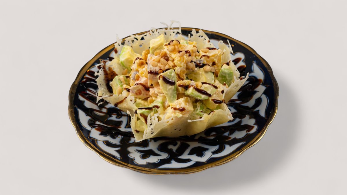 Микс листьев салата, помидор, огурец, перец, отварные куриные яйца, филе лосося, обжаренное со специями. Соус на основе майонеза, лайма и имбиря. Порция: 300 гр.