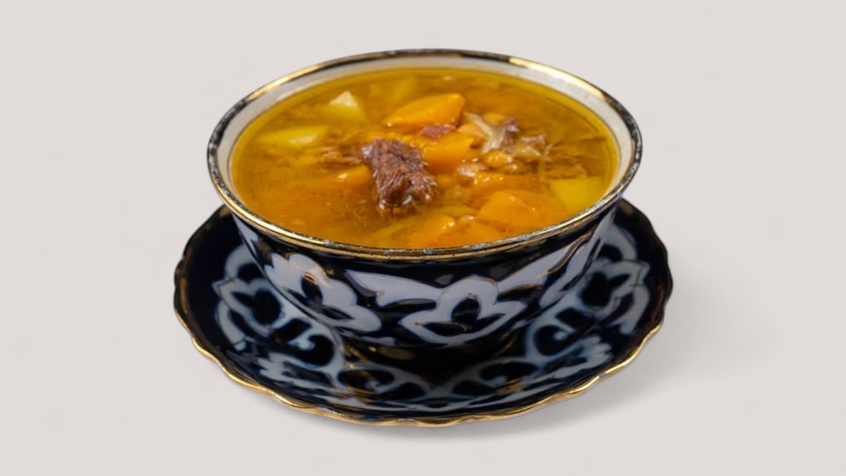 Ароматный суп с нежным мясом конины (жая), подается с зеленым луком и зеленью. 400 гр.
