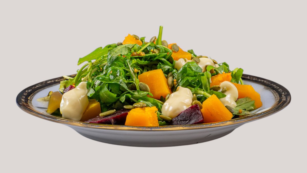 тыква,тыквенные семечки, руколла,сыр творожный. соус тыквенный, свекла