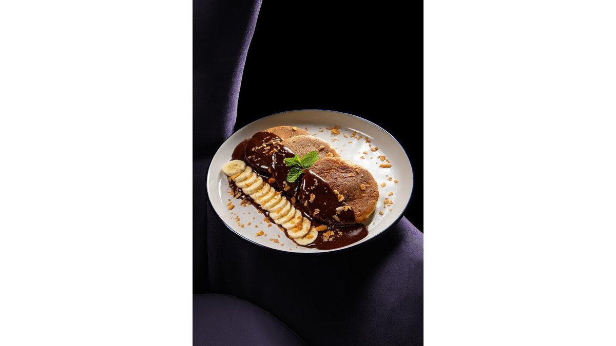 Fluffy American pancakes, Nutella, condensed milk, chocolate sauce, banana