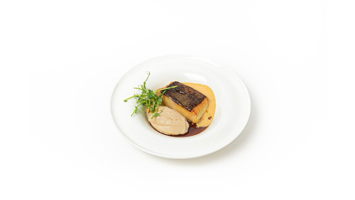 Baked tender halibut fillet in oyster sauce, served with green beans and corn, dressed with cream