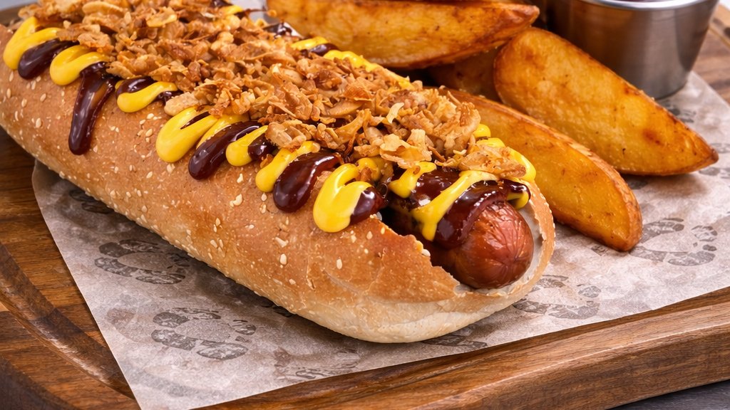 Поджаренная булочка с кунжутом, сочная сосиска на выбор: говядина / курица / баранина, фирменный соус BBQ и горчица, хрустящий жареный лук. Подаётся с золотистым картофелем дольками и соусом на выбор.