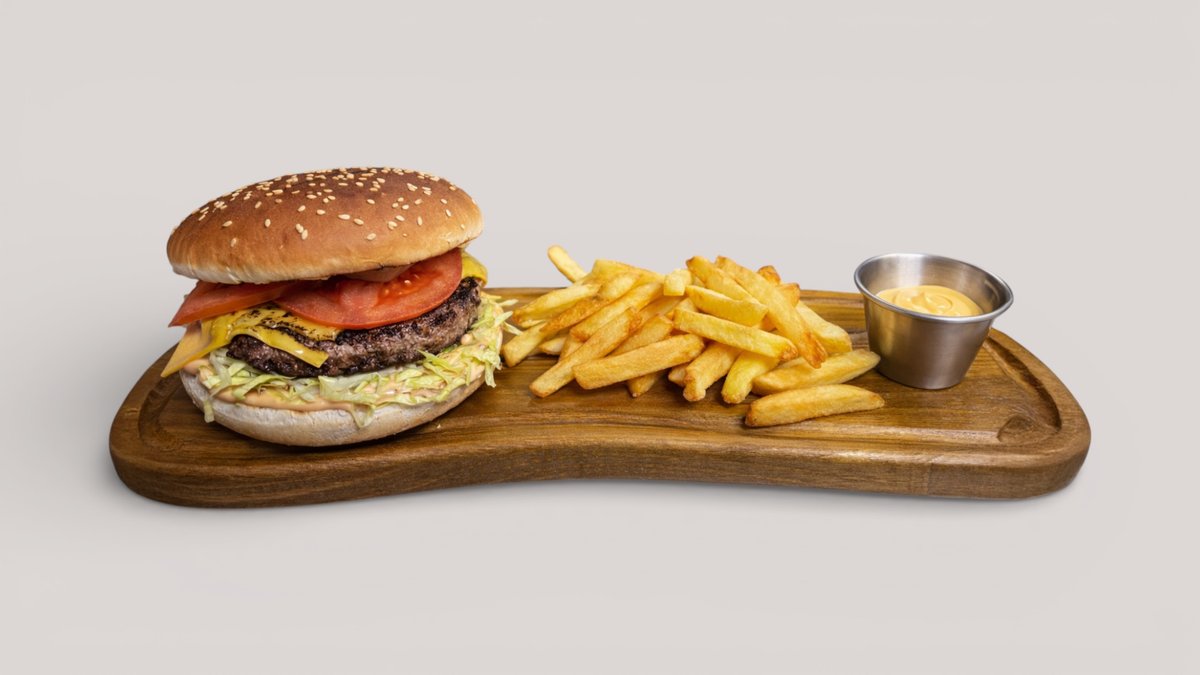 Классический бургер Сочный бургер с мраморной котлетой, сыром Чеддер, свежими томатами, хрустящим айсбергом и фирменным бургер-соусом.