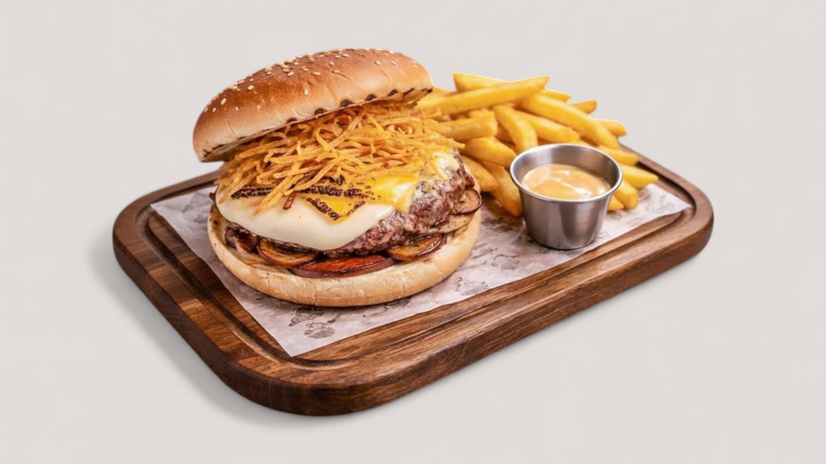 Нежный творожный сыр, расплавленный чеддер и тянущаяся моцарелла создают насыщенный сливочно-сырный вкус. Обжаренные шампиньоны добавляют глубину и аромат, а хрустящий картофель пай — идеальный контраст текстур. Сытный, сочный и по-настоящему сырный бургер для тех, кто любит максимум вкуса.
