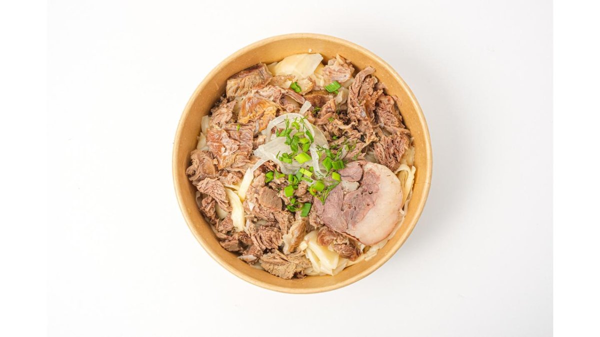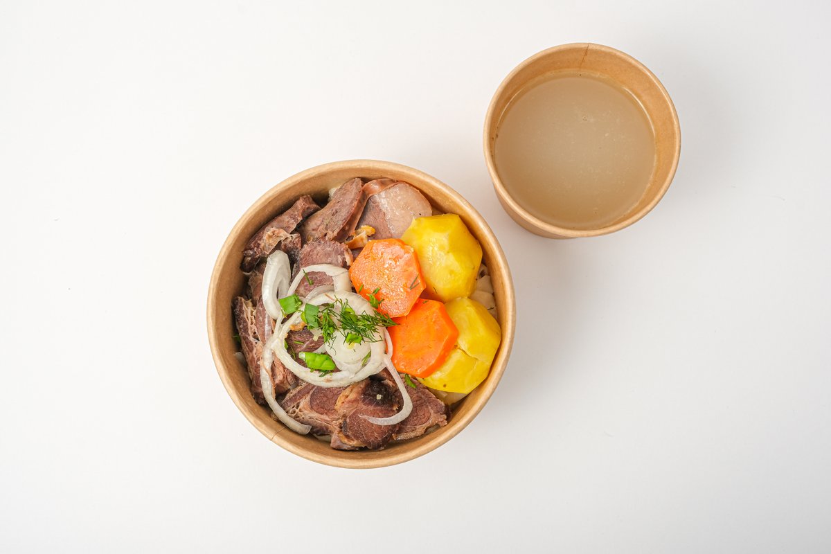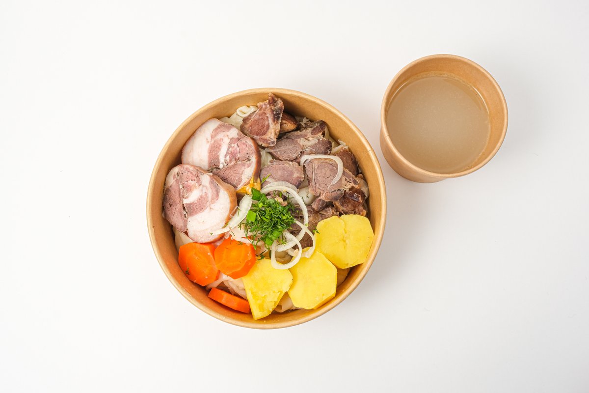 Бесбармак из конины с казы + сорпа, салат из квашенной капусты, соленый огурчик, баурсаки, коже
