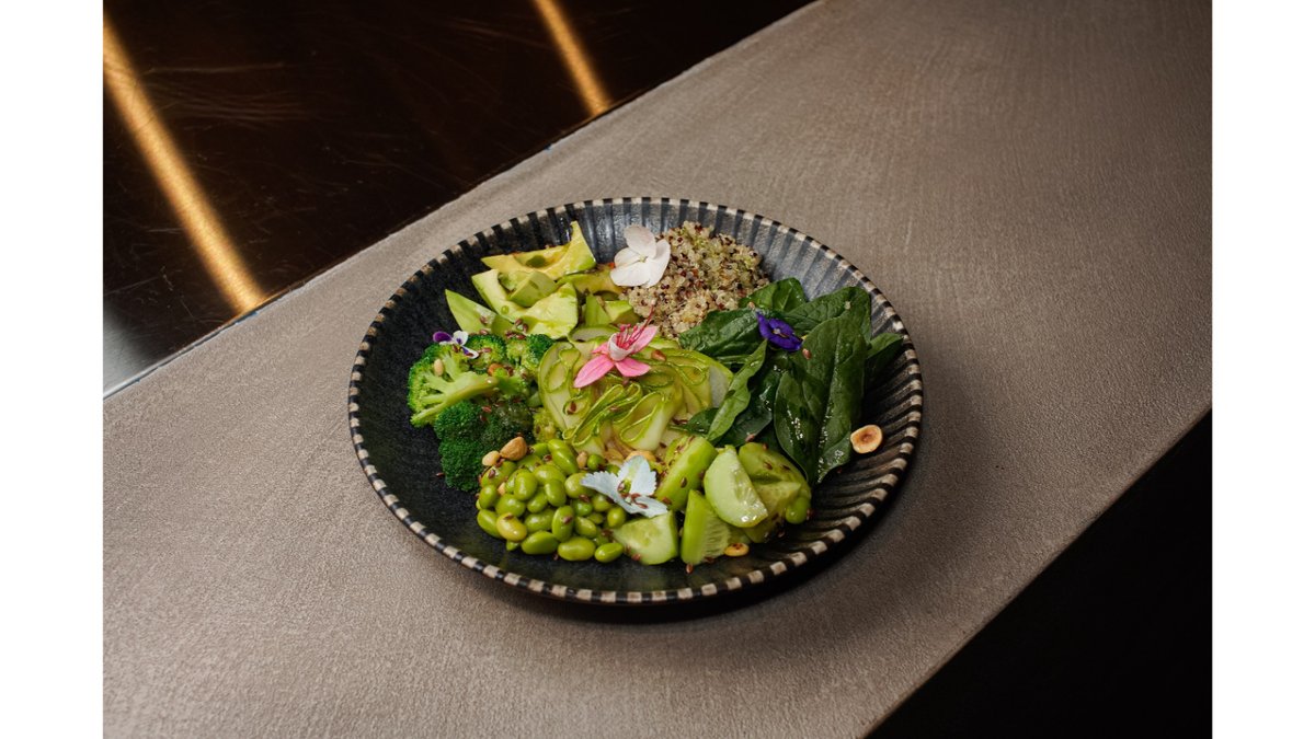 Зеленая гречка с куртом, с овощным салатом и куриная грудка BBQ