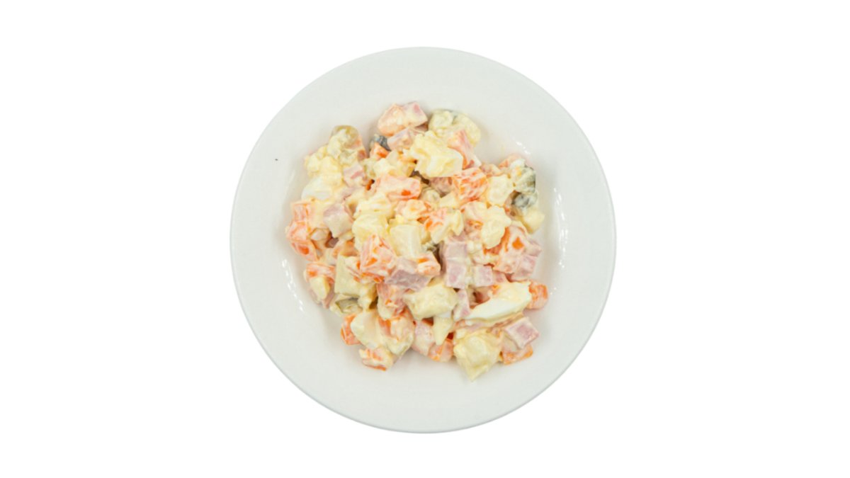 Традиционный салат из отварного картофеля, моркови, зелёного горошка, соленых огурцов, яиц и вареной колбасы, заправленный майонезом. Сытный и любимый многими вкус домашней кухни.