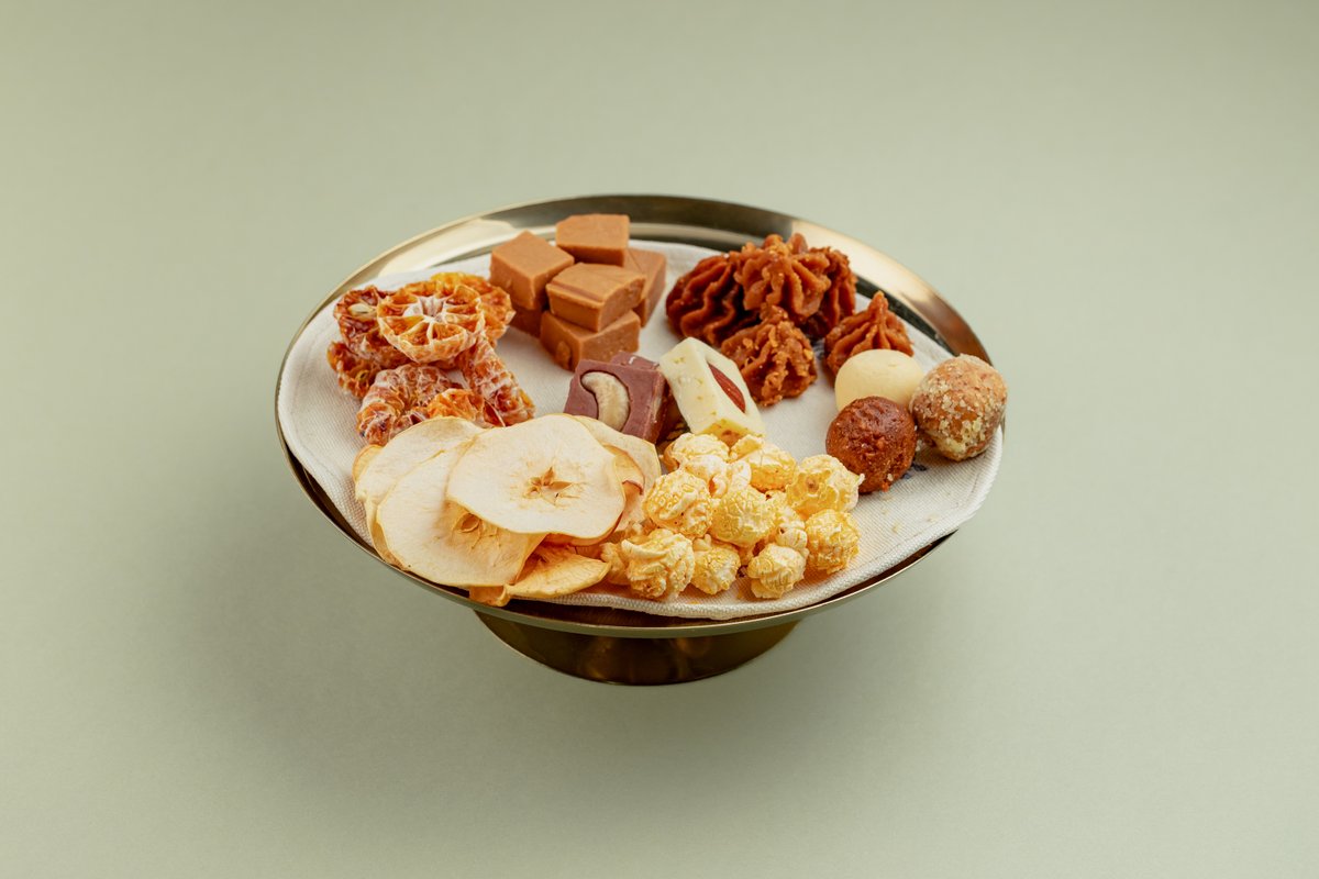 Жент, балкаймак, сушеный абрикос, чипсы из яблок, мандарины