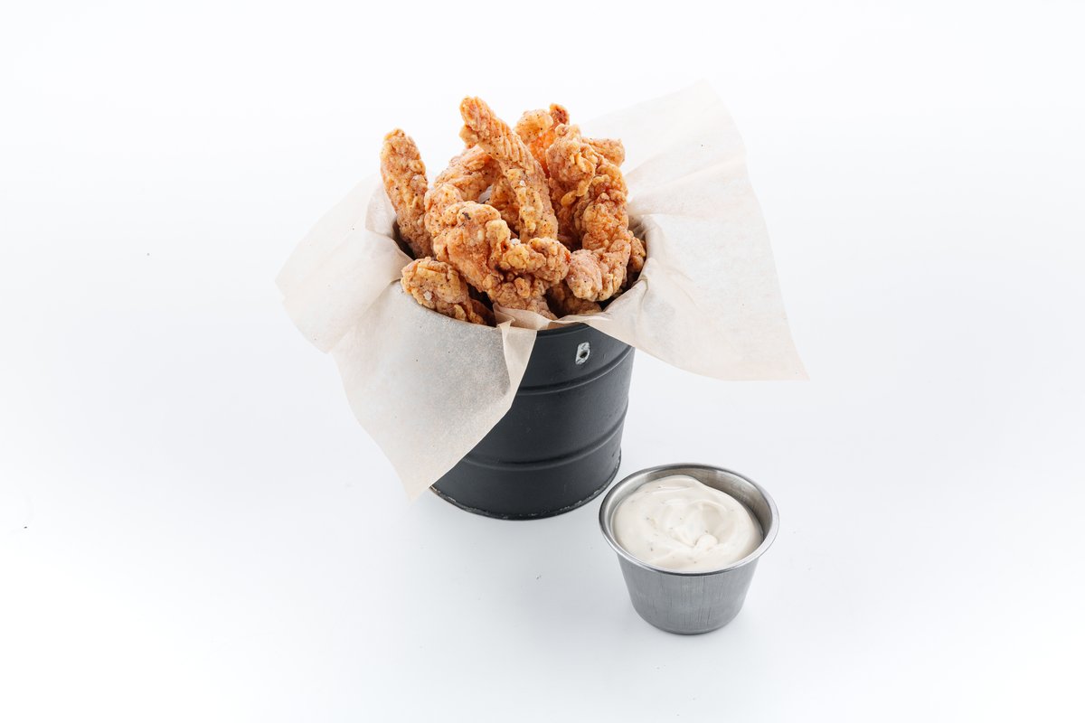 Куриное филе , обжаренное в панировке, подается со сливочно чесночным соусом
