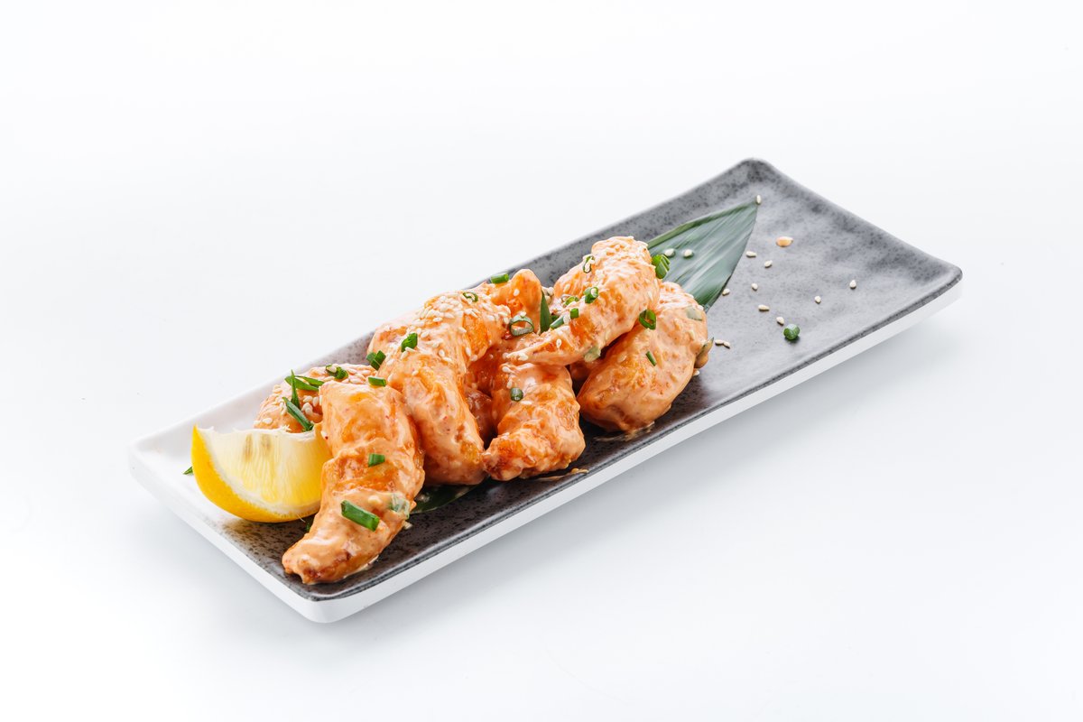 Микс салата, обжаренные картофельные дольки, помидоры черри, обжаренная курица в кляре заправленная сладко- острым соусом Сан Диего и посыпан кунжутом