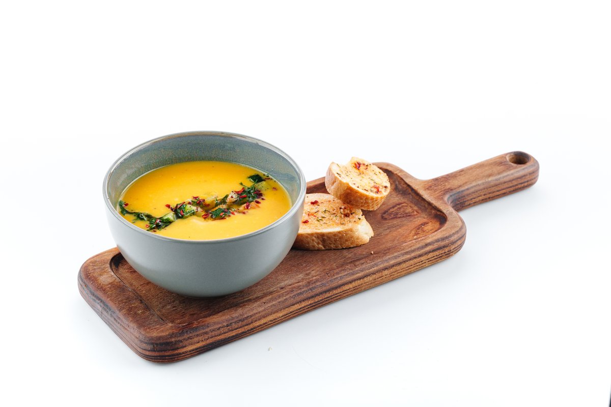 Тыквенный крем суп с тар-таром из кабачка и креветки