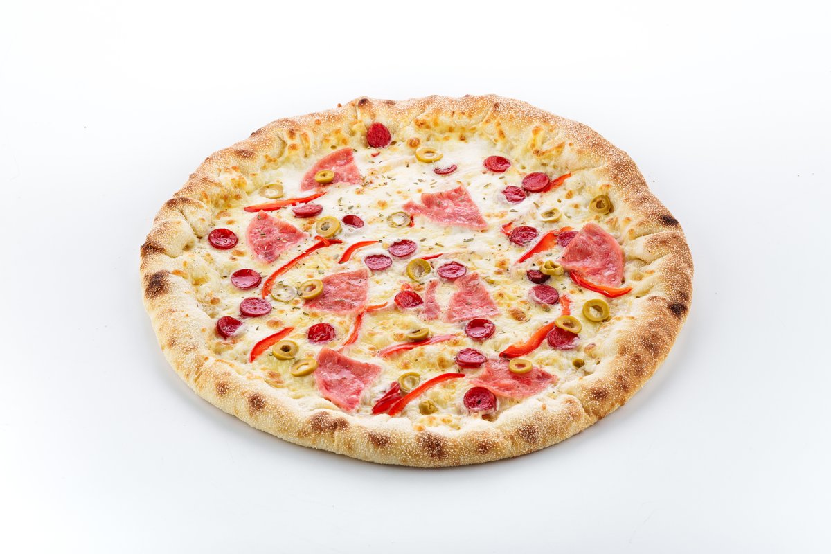 Классическая римская пицца с охотничьими колбасками, говяжей ветчиной, болгарским перцем, оливками и сыром моцарелла