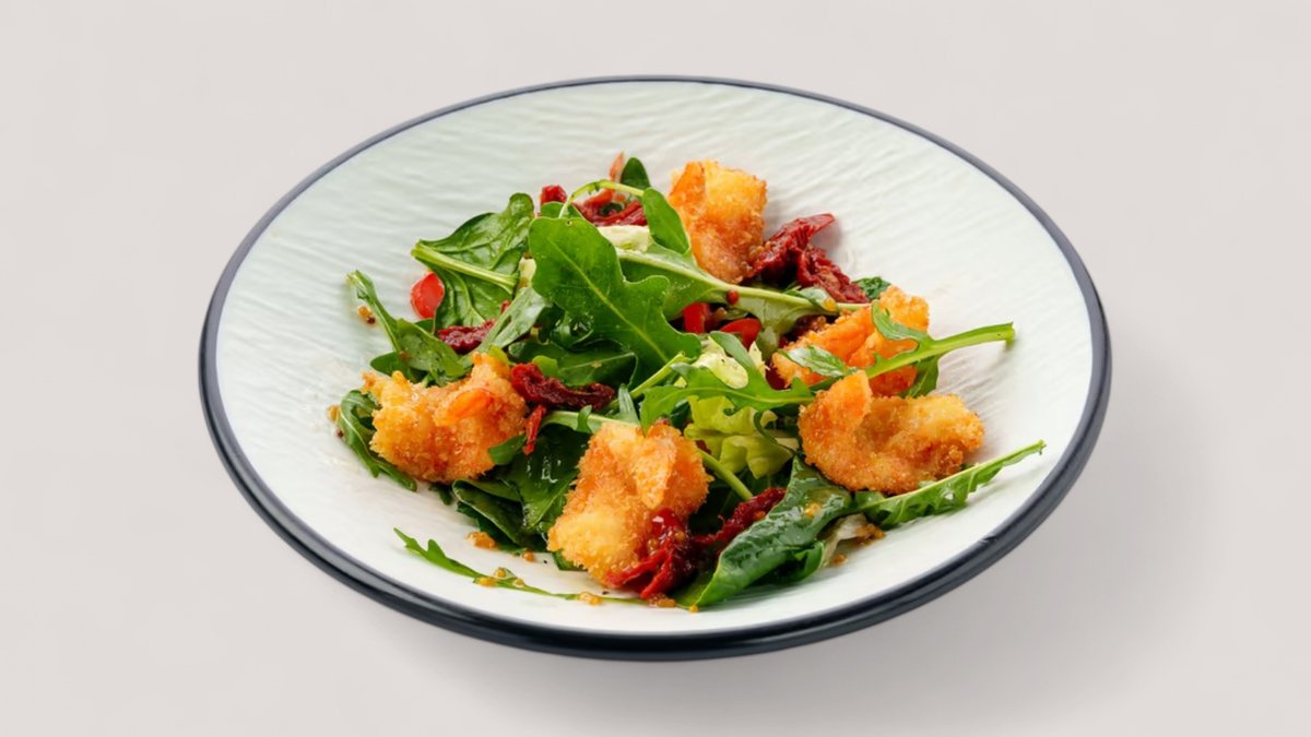Легкий салат с добавлением рукколы, свежих и вяленых томатов, креветками в панировке в медово-горчичной заправке