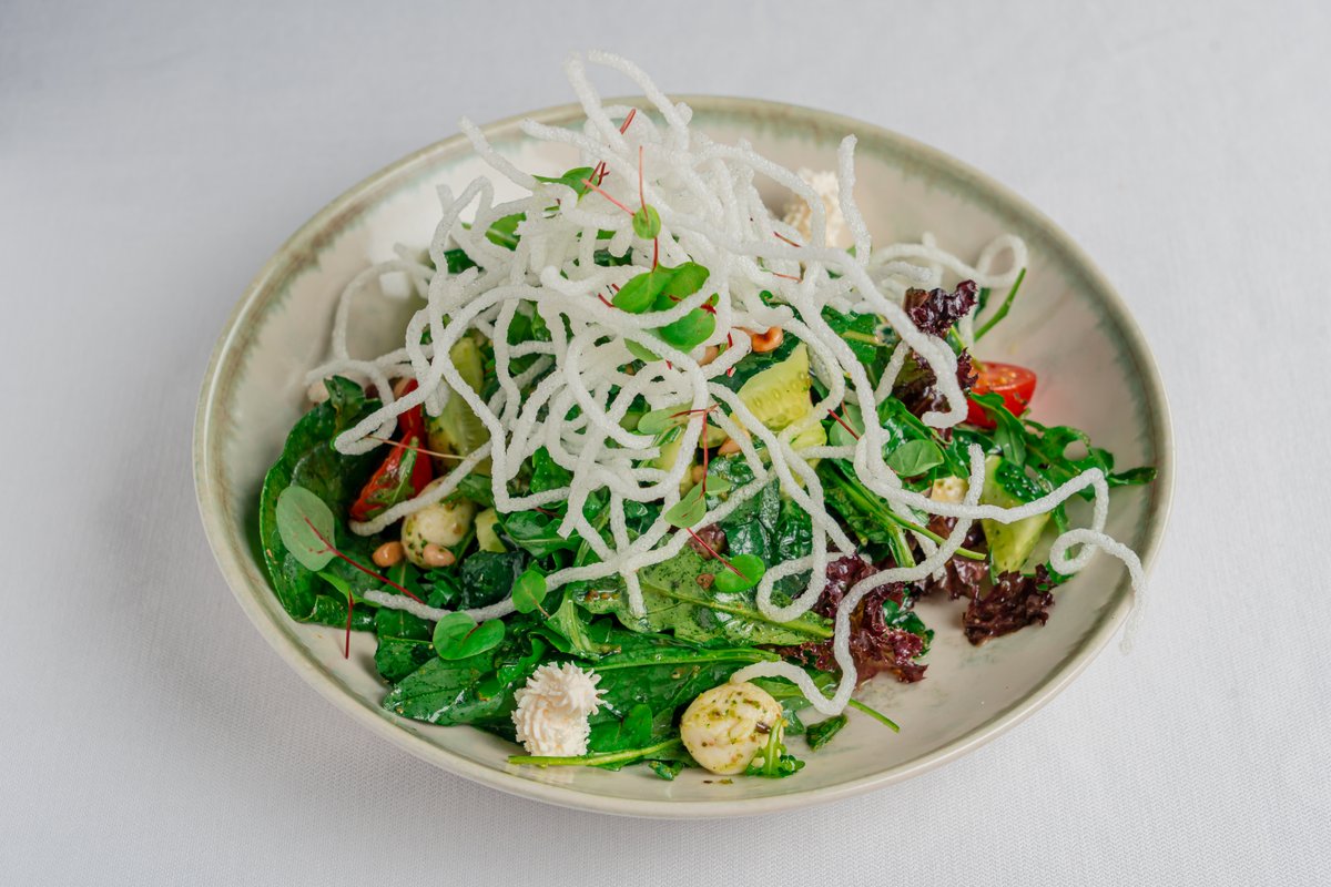 помидоры черри, сыр моцарелла, огурчики, микс салат, кедровые орешки, сыр крем чиз с соусом песто