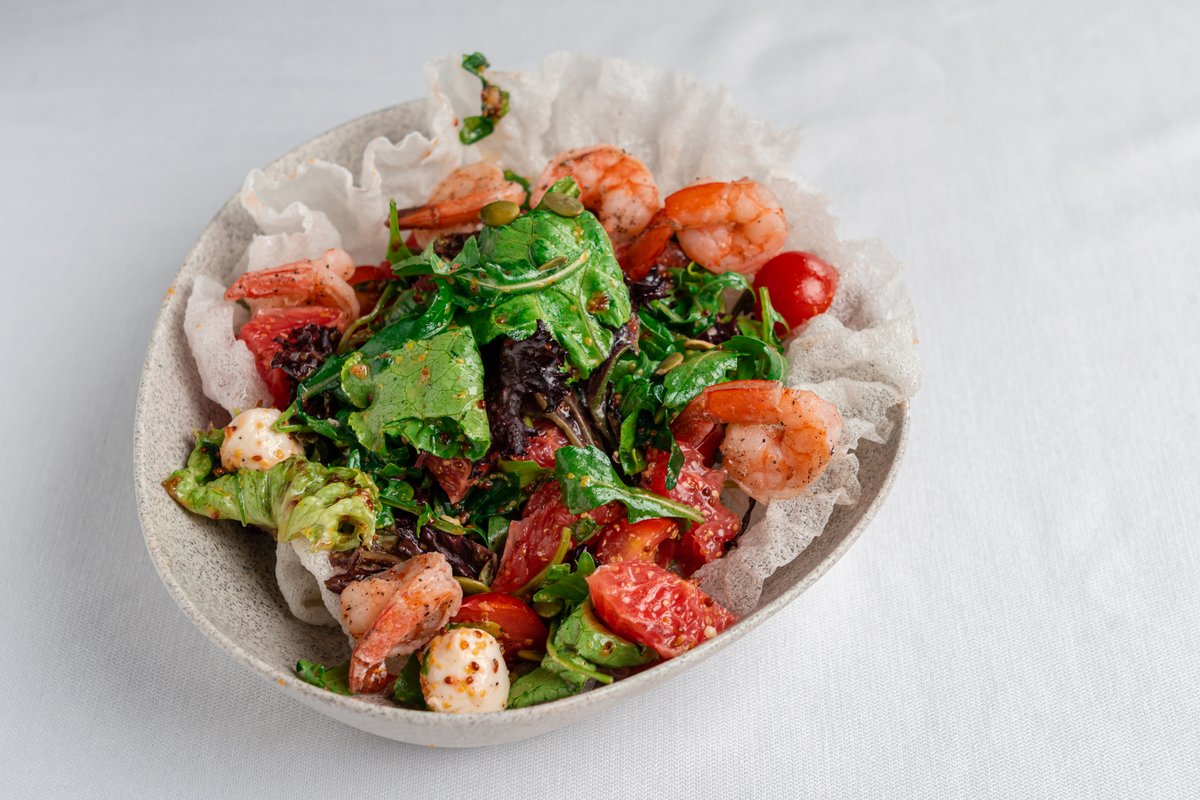 грейпфрут, помидорки черри, моцарелла, микс салат с медово-горчичным соусом