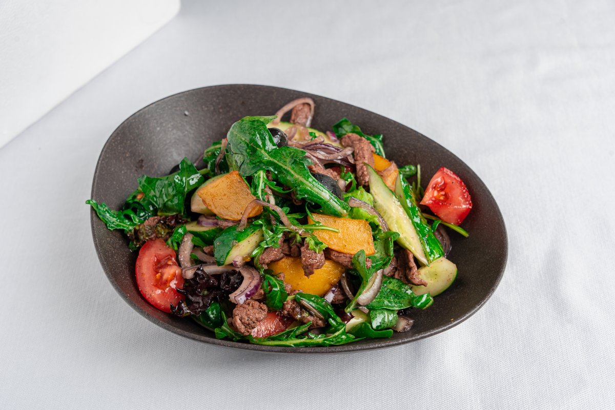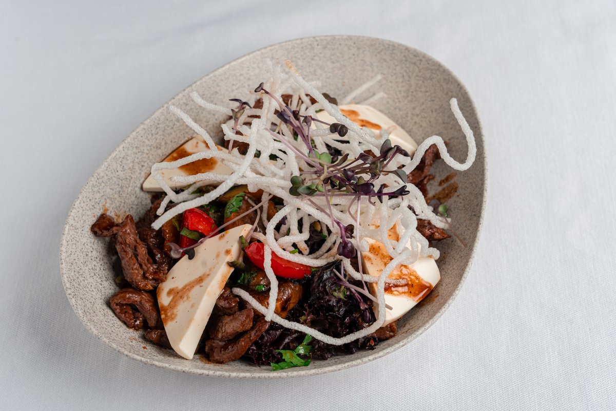 говядина, светофор, шампиньоны, фета, паназиатский соус, микс салат