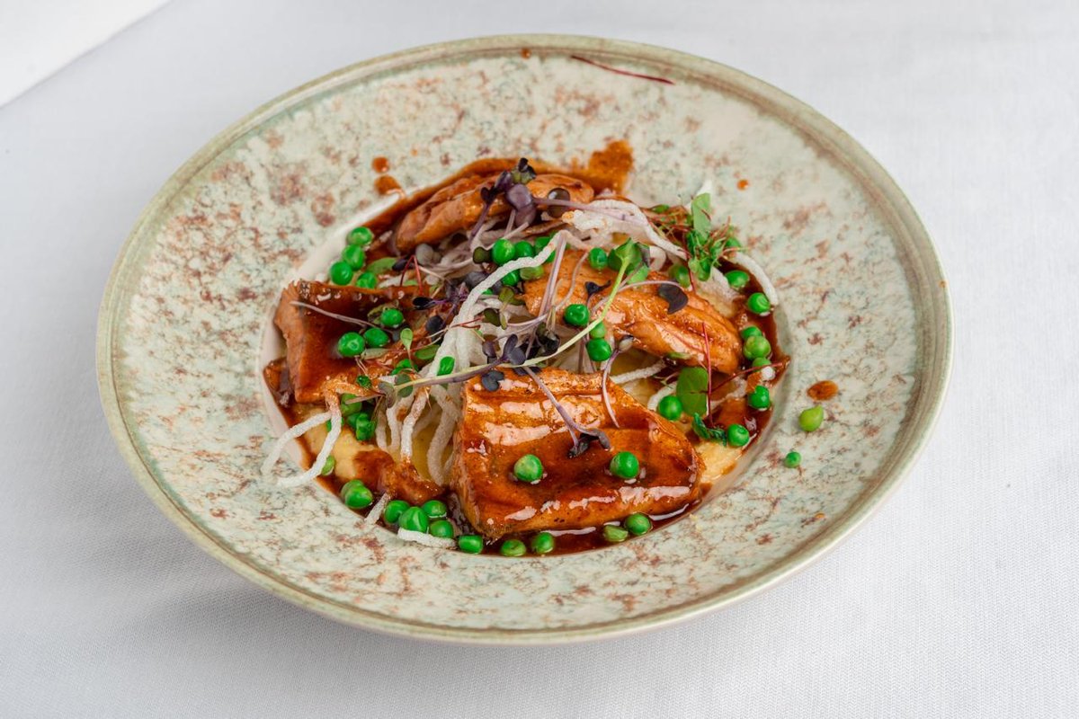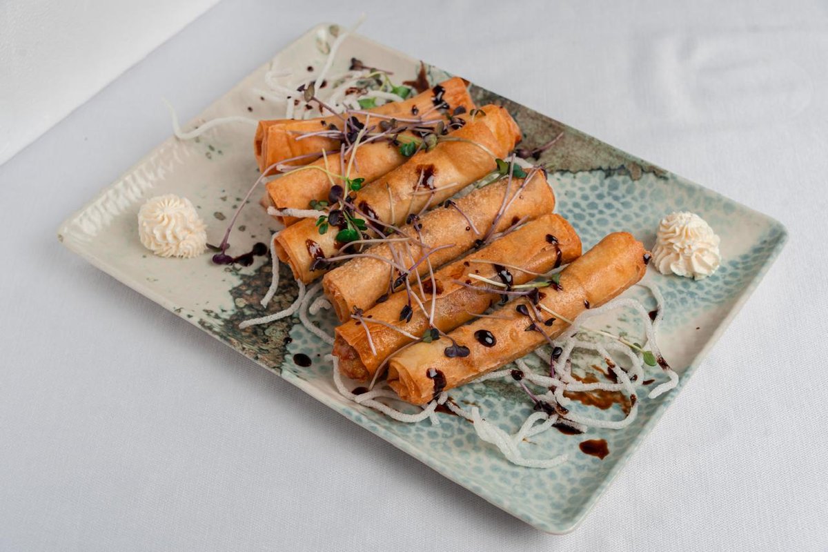 баклажанчики, микс салат, помидоры, брынза, сыр крем чиз с кисло-сладким соусом
