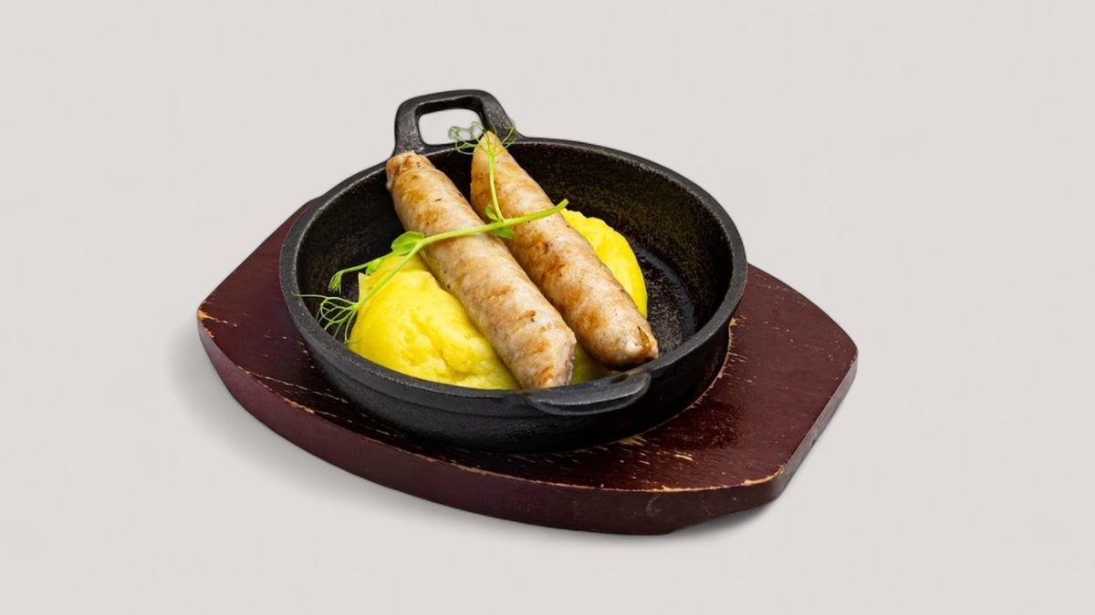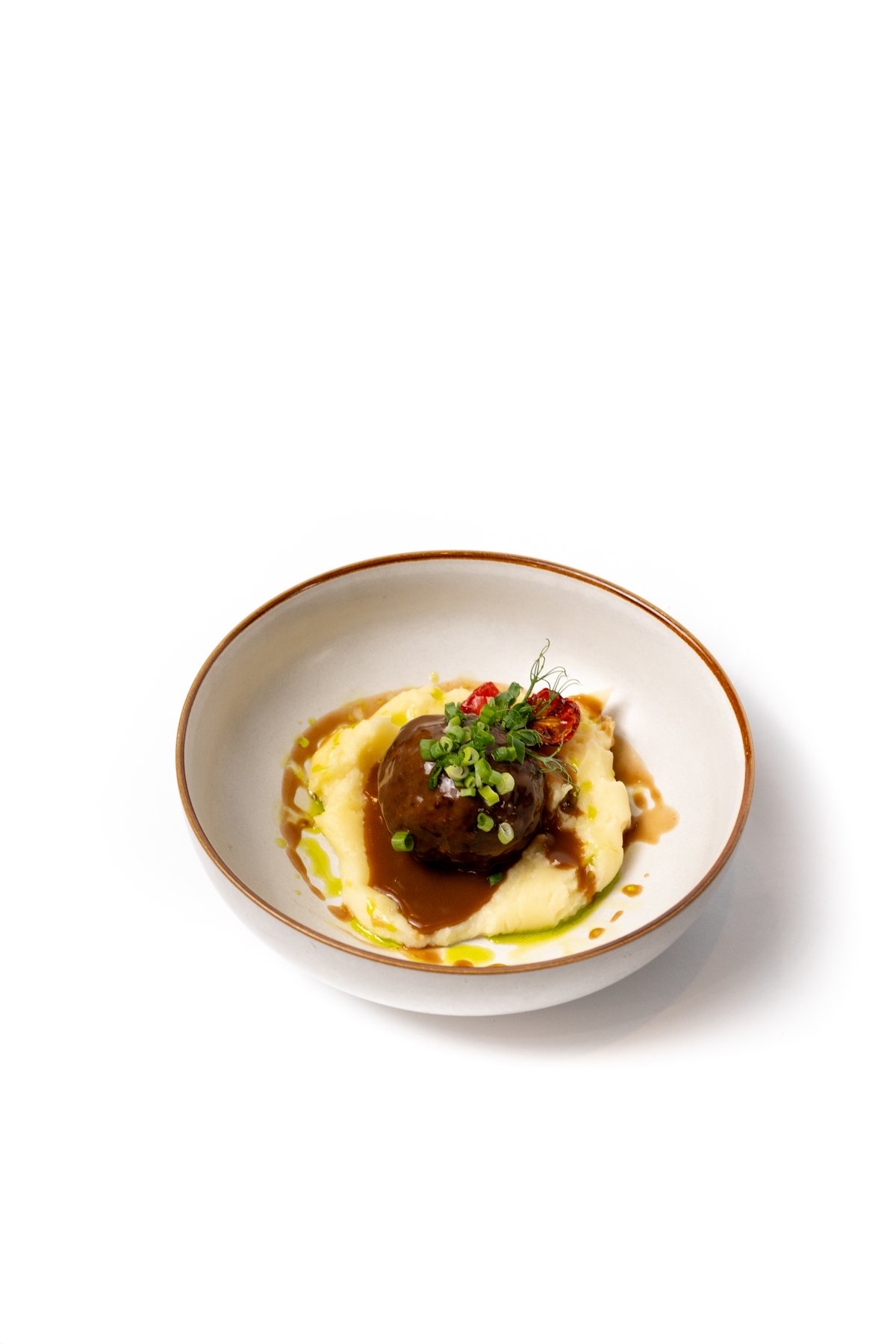 "Куриные фрикадельки в хрустящей бархатной панировке с картофельным пюре и томатным соусом."