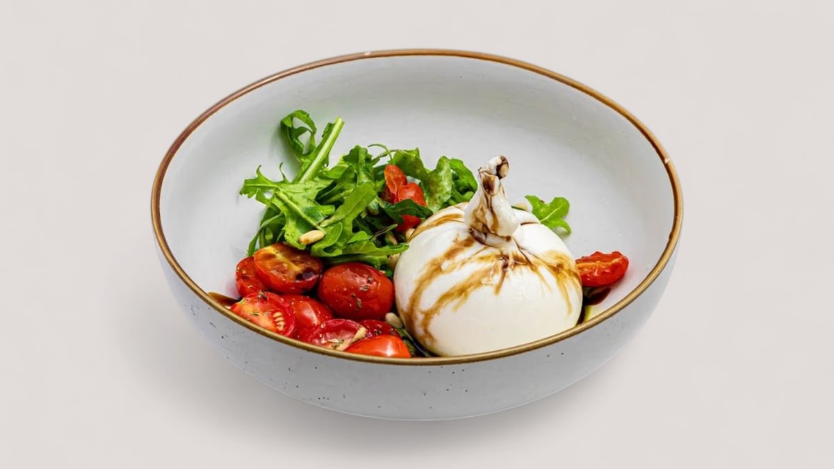 "Паста Италия, соус томатный, масло чесночное, масло сливочное, помидоры черри, сыр страчателла, базилик"