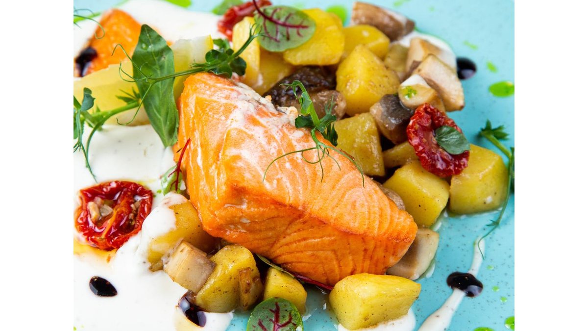 Солодовый хлеб в сочетании нежным сыром страчателлой ,семги "Гравлакс",вяленые черри,микс салата