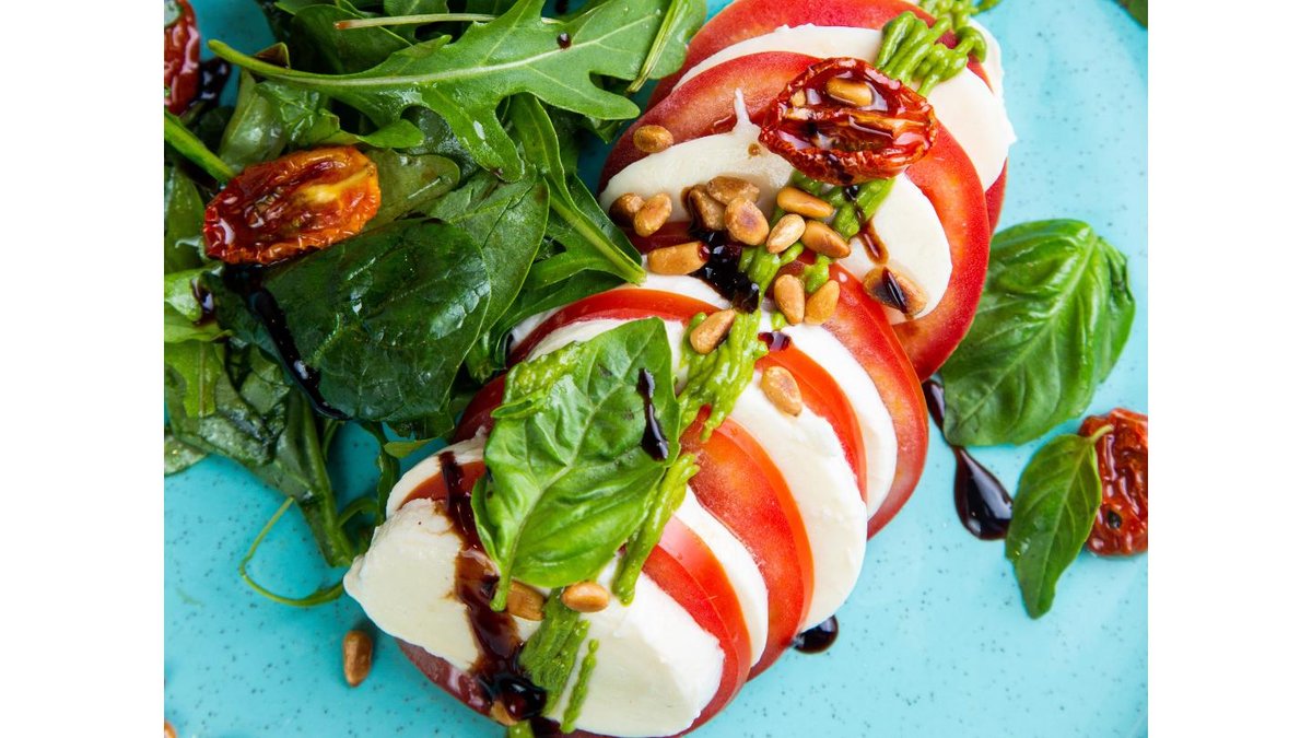Салат на основе свежих томатов ,сыра Моцарелла собственного приготовления by Capito-шеф базилика ,рукколы и кедрового ореха в сочетании с соусом Песто