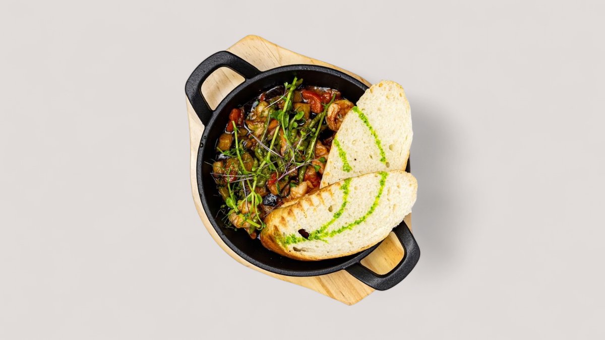 "Ароматные креветки на гриле с овощами и соусом песто, подаются с хрустящим багетом"
