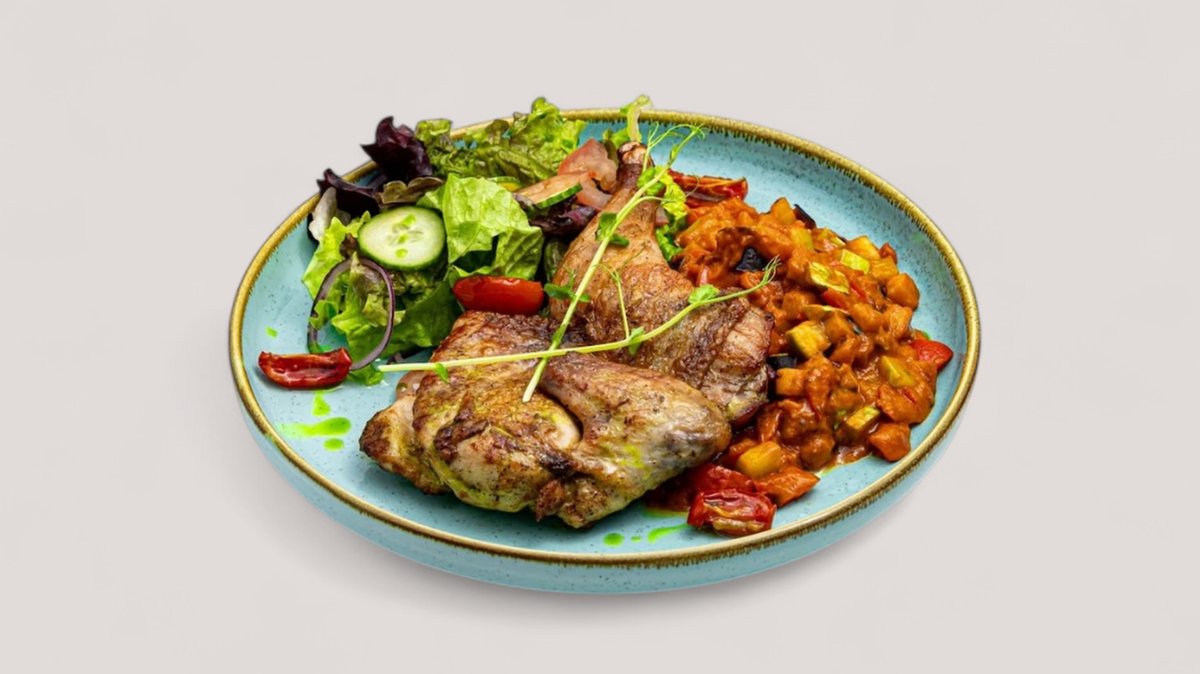 Микс из телячьего и куриного филе в сочетании с томатным соусом и зеленью.Подается с рисом карри