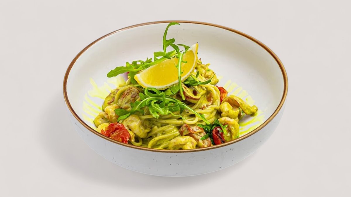 "Изысканное сочетание двух соусов (сливочный и соус песто) с ароматными креветками."