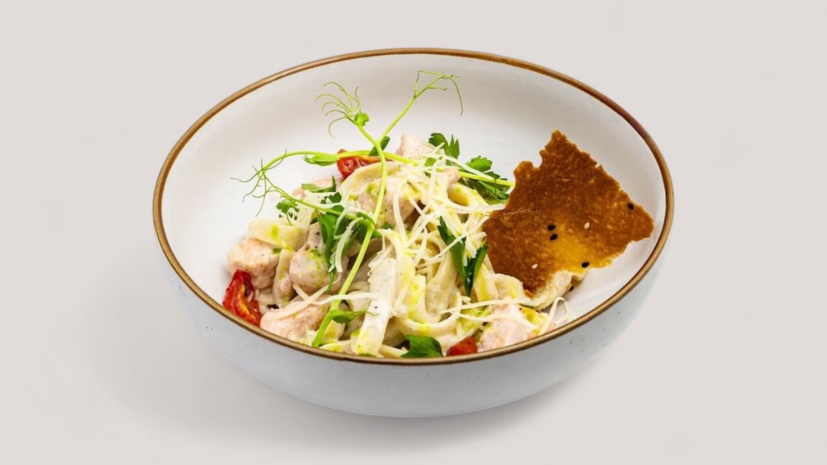 "Настоящая итальянская паста феттучини с нарезанной кусочками нежнейшей семги под ароматным сырным соусом - на мгновение перенесет Вас в итальянскую атмосферу романтики и тепла."