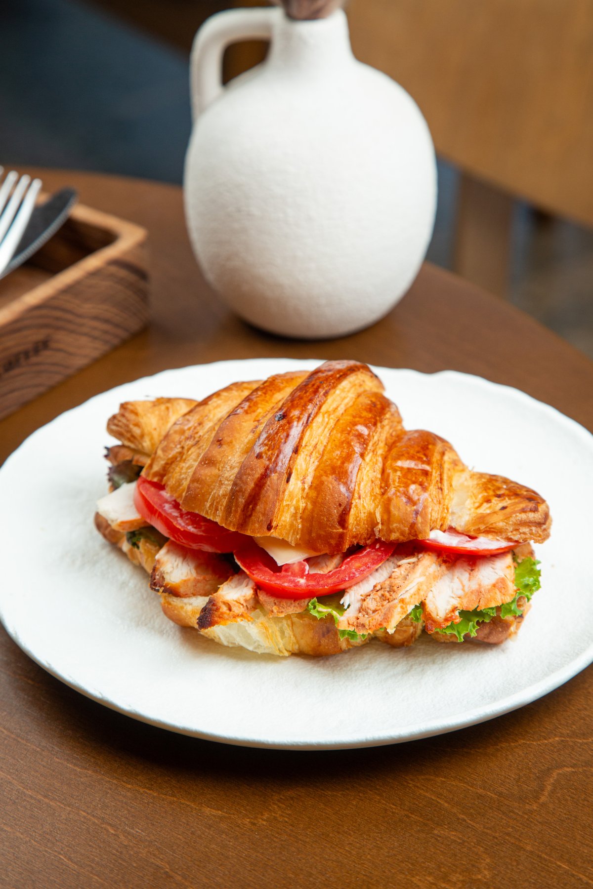 Круассан с курицей — аппетитный сэндвич, в котором хрустящий круассан наполняется сочным куриным филе, свежими листьями салата, расплавленным тостерным сыром и ломтиками помидора.
