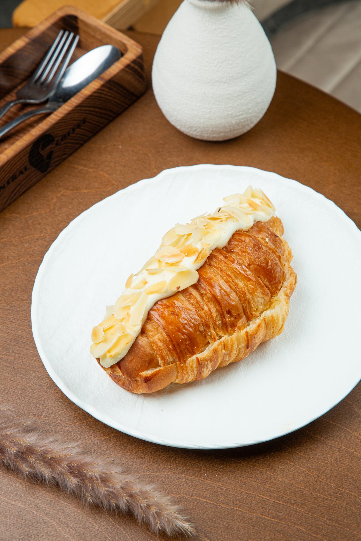 С миндальной начинкой и со сливочным кремом посыпанным миндальными слайсами.