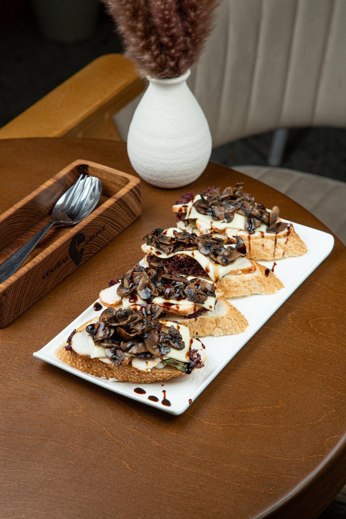 Брускетты с курицей — сытная закуска, в которой нежное куриное филе сочетается с тостерным сыром, обжаренными грибами и свежей рукколой. Всё это дополняется лёгким слоем майонеза, создавая гармоничное и вкусное блюдо, идеально подходящее для перекуса или в качестве аппетитного старта к обеду.