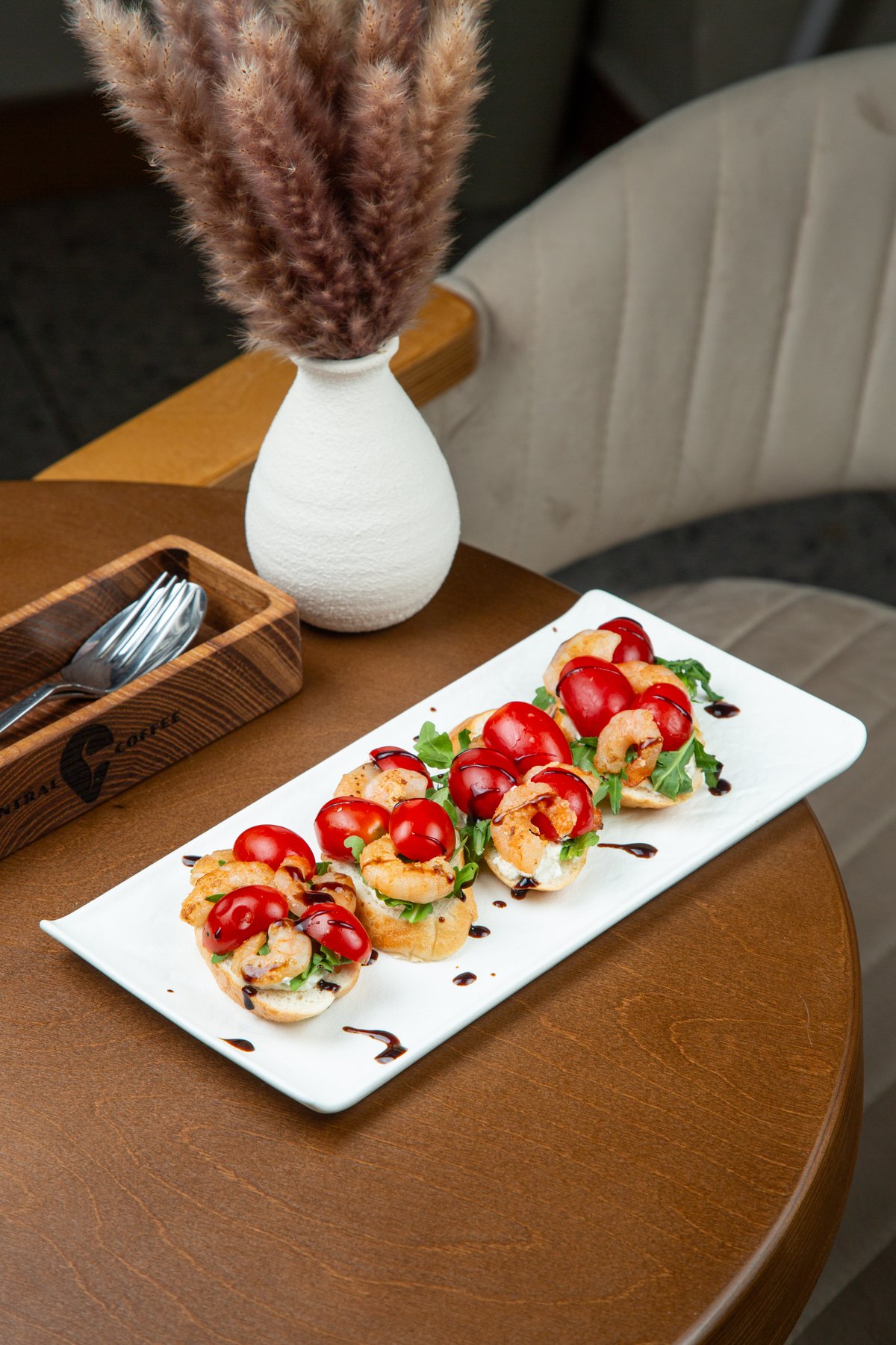 Брускетты с креветками — изысканная закуска, где нежные креветки сочетаются с креметтой, сочными черри помидорами и ароматной рукколой. Завершающим штрихом служит тонкий слой бальзамического соуса, придающий блюду насыщенный и сбалансированный вкус.
