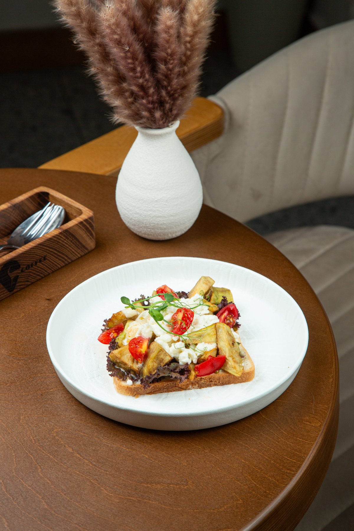 Тост с баклажаном — вкусное и сытное блюдо, в котором хрустящий тостовый хлеб намазан сливочным сыром кремета и покрыт жареными баклажанами. Добавлен мягкий сыр моцарелла Гальбани со сливками и ломтиками свежих помидоров, украшенной с зеленью.