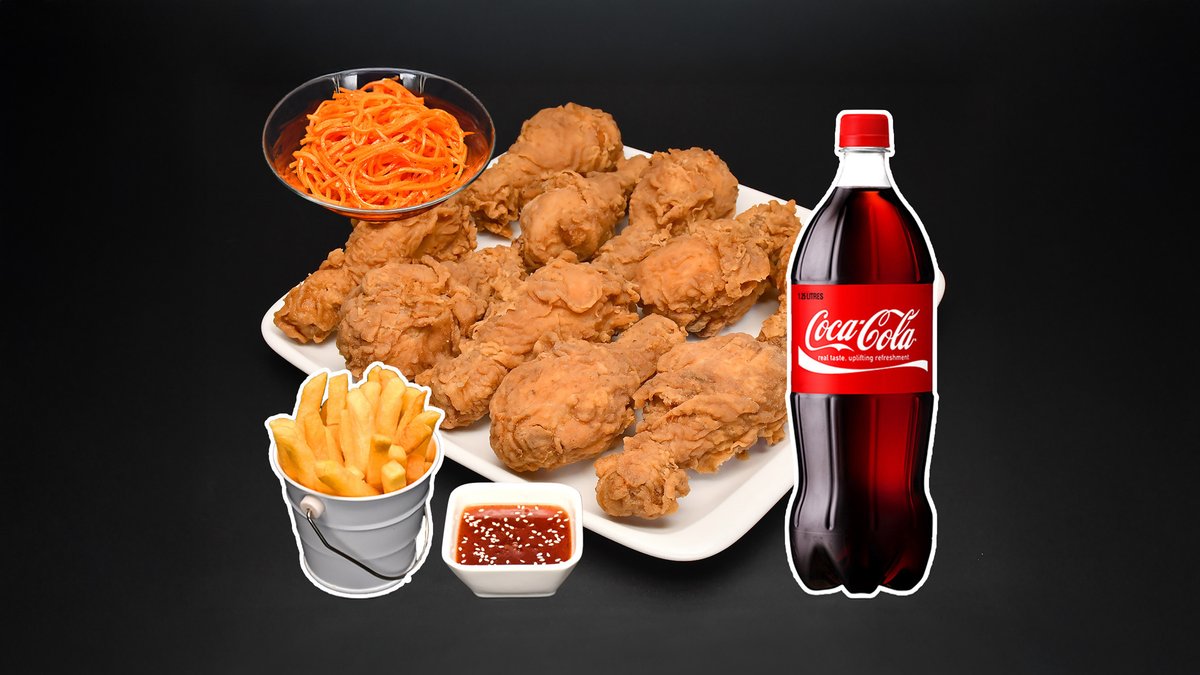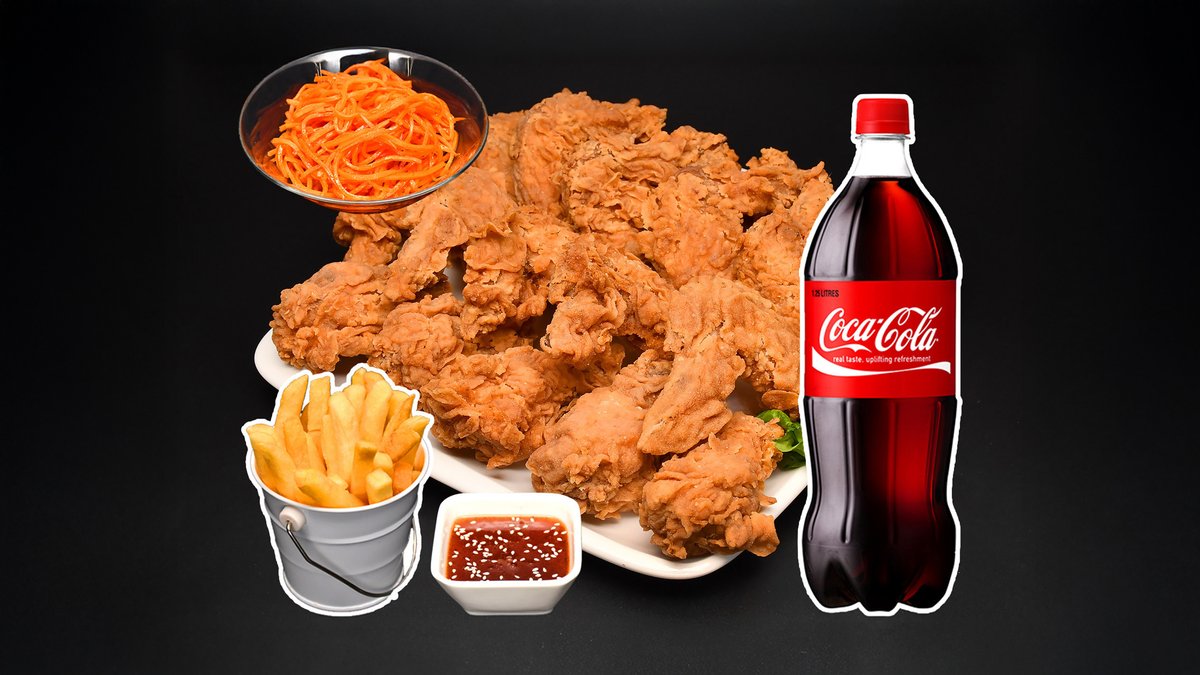 1 кг хрустящего филе без соуса, порция фри, салат морковь-ча, напиток Кола 1л.