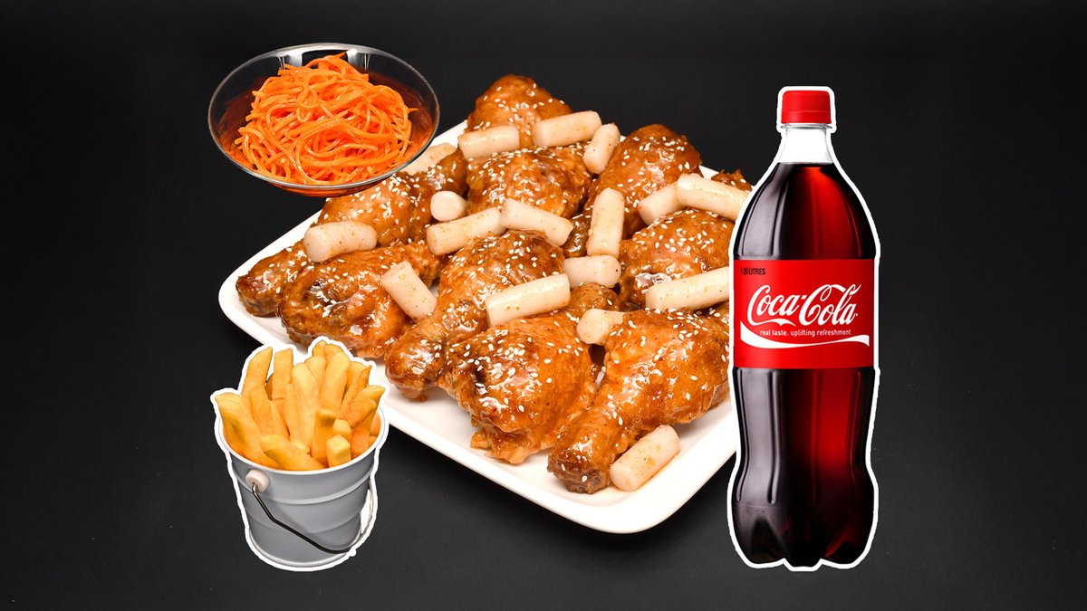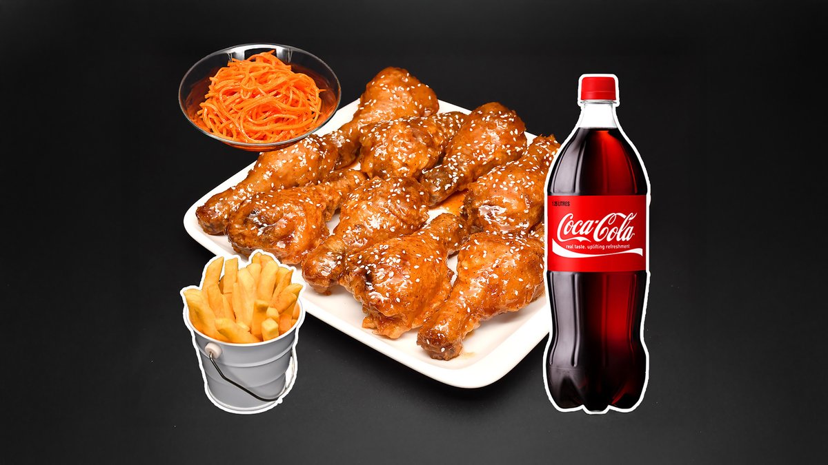 1 кг хрустящих крылышек с рисовыми палочками тток в сладко-остром соусе средней остроты, порция фри, салат морковь-ча, напиток Кола 1л.