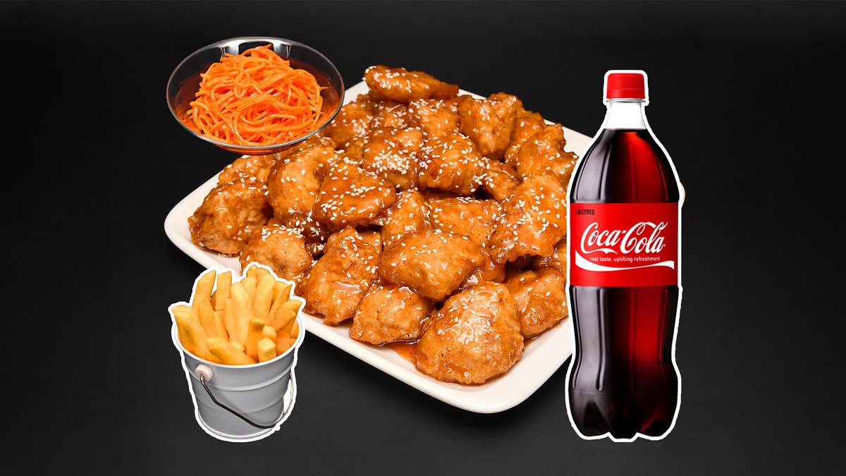 1 кг филе в сладко-остром соусе средней остроты, порция фри, салат морковь-ча, напиток Кола 1л.
