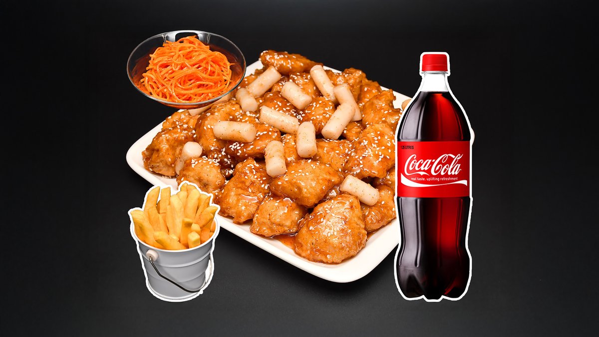 1 кг филе с рисовыми палочками тток в сладко-остром соусе средней остроты, порция фри, салат морковь-ча, напиток Кола 1л.
